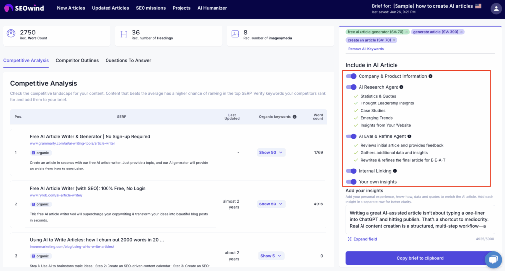In order to add your own insights, just toggle on Your own insights when creating the brief (Section: Include in AI Article within Build your brief) and add your thoughts in the field.